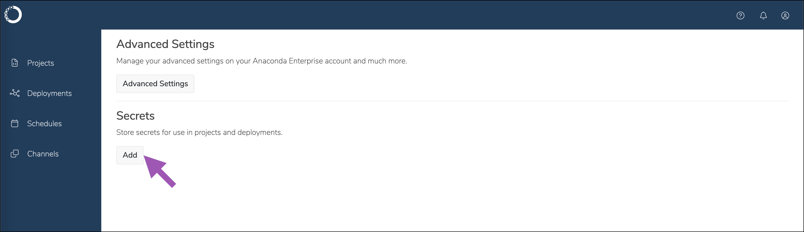 Anaconda strongly recommends using secrets as opposed to including credentials in your project, due to the security risk associated with storing them in version control.