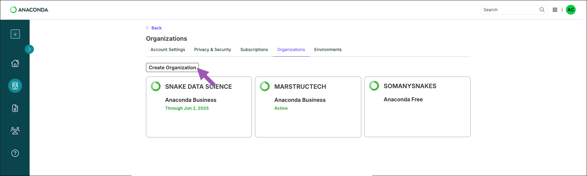 Organization administrators are provided with some control over the access their members have to Anaconda.com assets, ensuring that members have appropriate access to the tools and data they need, while safeguarding sensitive information by restricting access where necessary.- Navigate to your Organizations page.