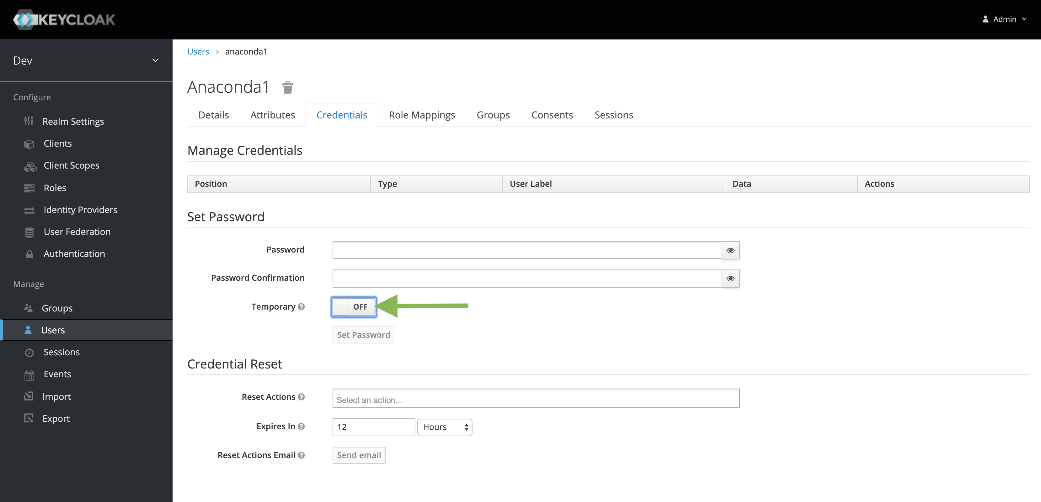 Follow these steps to set or remove the admin role for a Team Edition user:- In Keycloak, under Manage, navigate to the Users page.