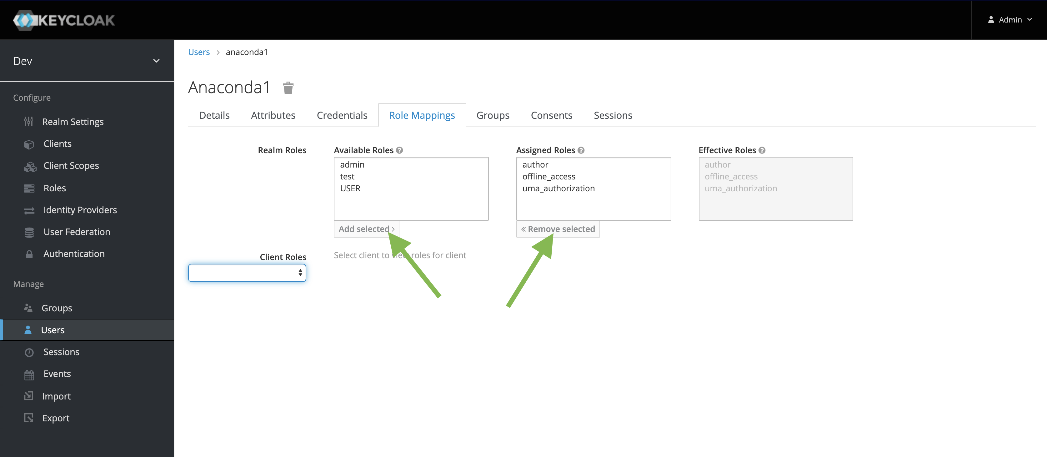- To set the admin role: Under Available Roles, select admin and click Add selected. To remove the admin role: Under Assigned Roles, select the user and click Remove selected.