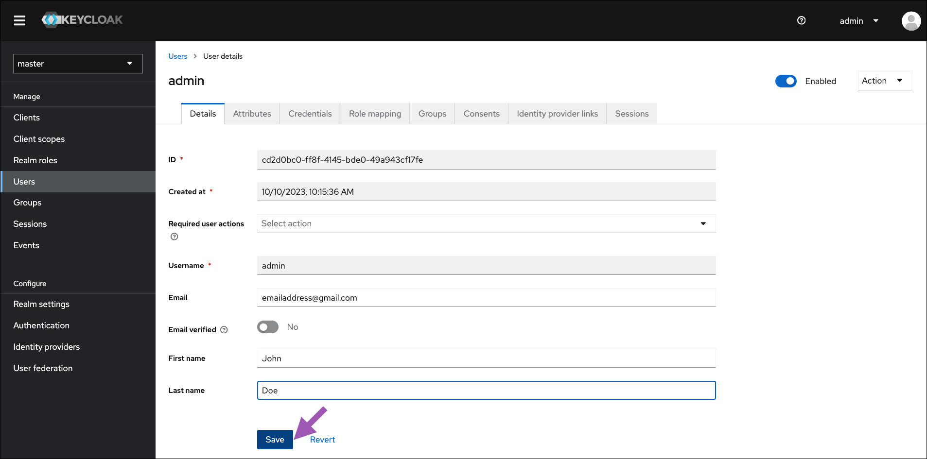 To update the email address that is associated with the Keycloak admin user:- Access the Keycloak administrative console.