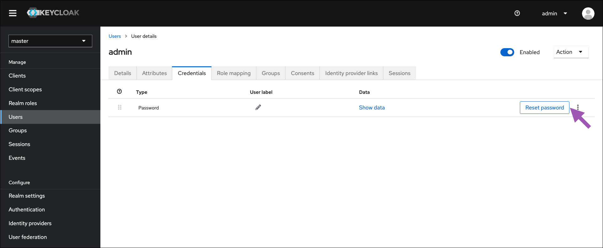 To view your users at any time, complete the following steps:- Access the Keycloak administrative console.