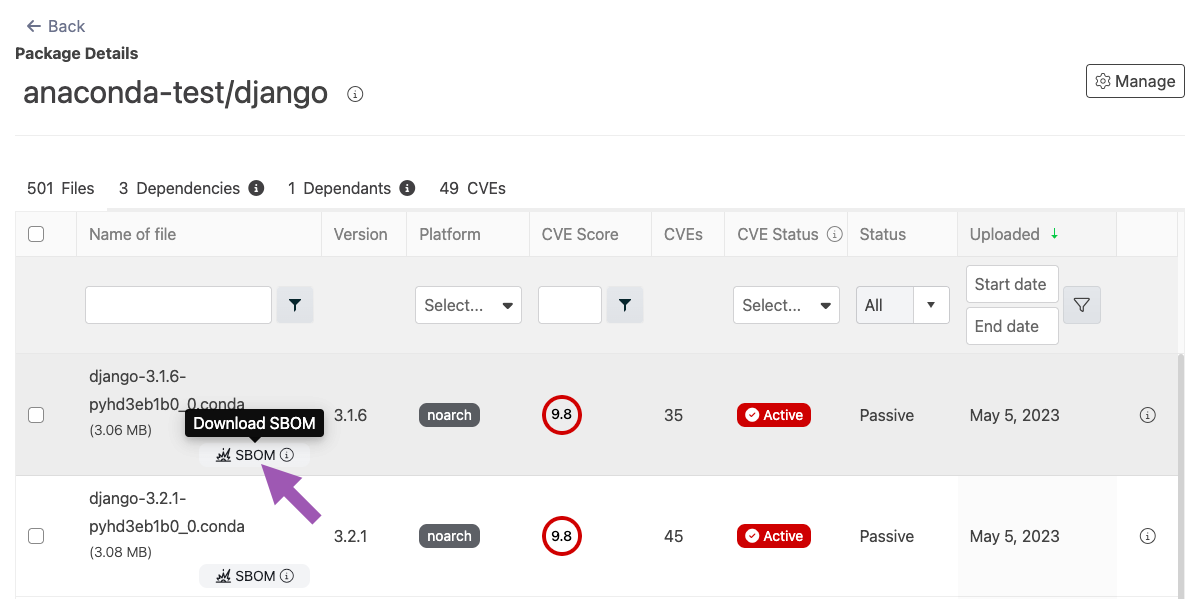 Click the SBOM badge beside a package file to download an SBOM for that file version.